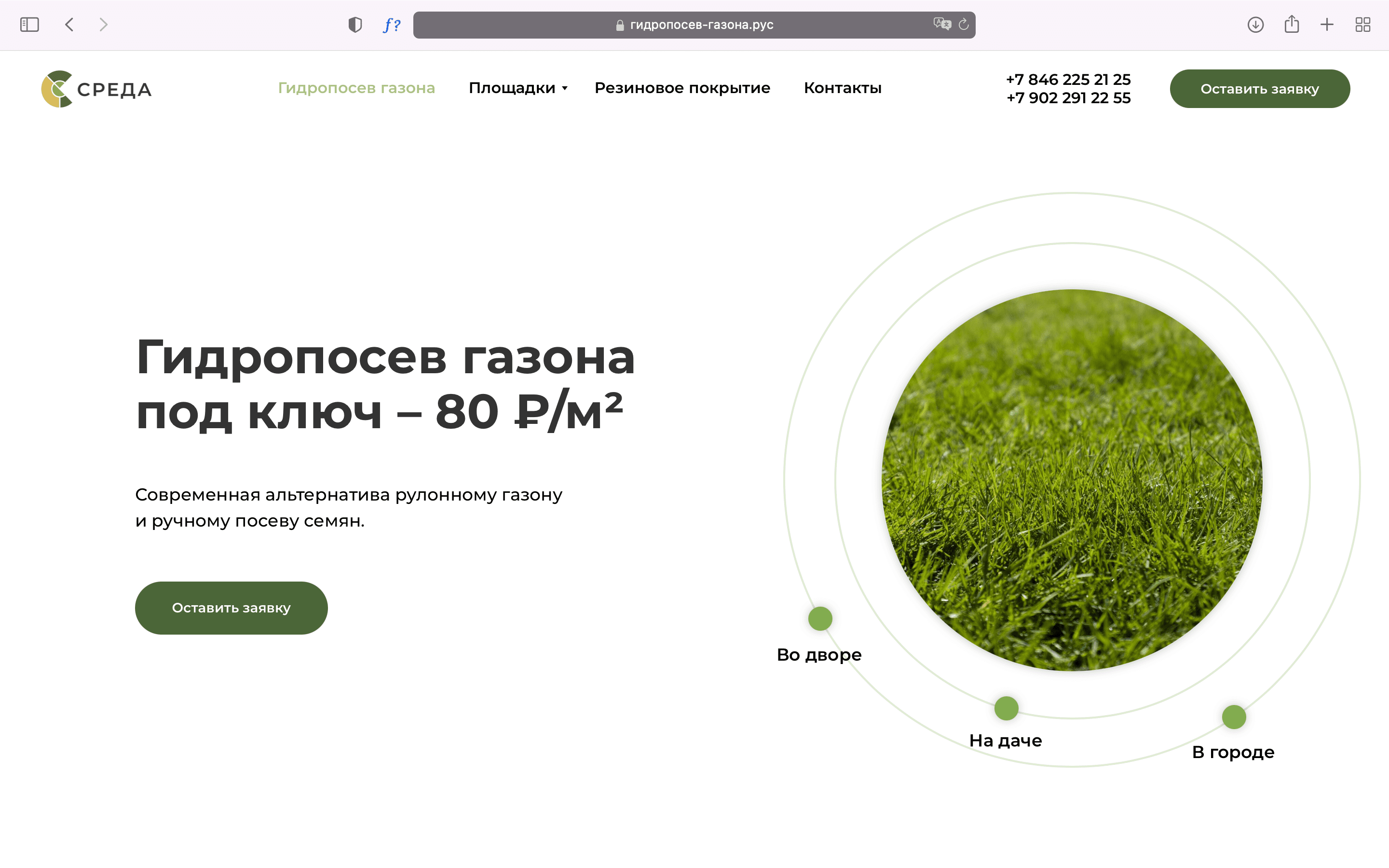 компания имеет несколько направлений деятельности – гидропосев газона, установка детских и спортивных площадок, монтаж резинового покрытия.